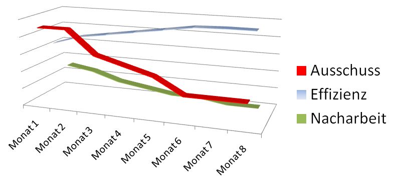 Reduzierung von: - Ausschuss - Nacharbeit - Stillständen - nicht wertschöpfenden Arbeitsschritten - Wechsel-, Rüst- und Umstellungszeiten - Bestand von halbfertigen Teilen - Materialeinsatz - Materialverlusten |